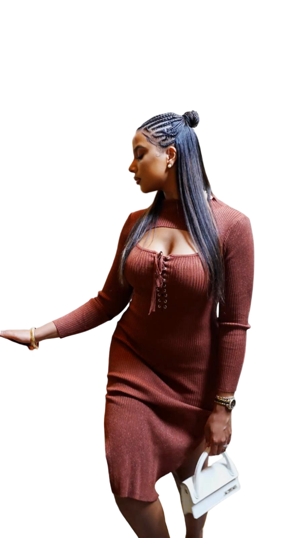 Crafted from a finely ribbed knit that glides over the body, this form-skimming dress features a high neckline that frames the décolletage and a delicate lace-up accent to draw the eye. The long sleeves and subtle side slit add a touch of modern flair, while the midi length strikes the perfect balance between sophistication and ease. Pair it with gold-tone earrings and strappy heels for evening allure, or layer under a tailored blazer with suede ankle boots for a daytime ensemble that transitions effortlessly into night.
