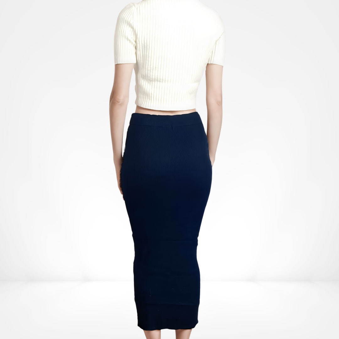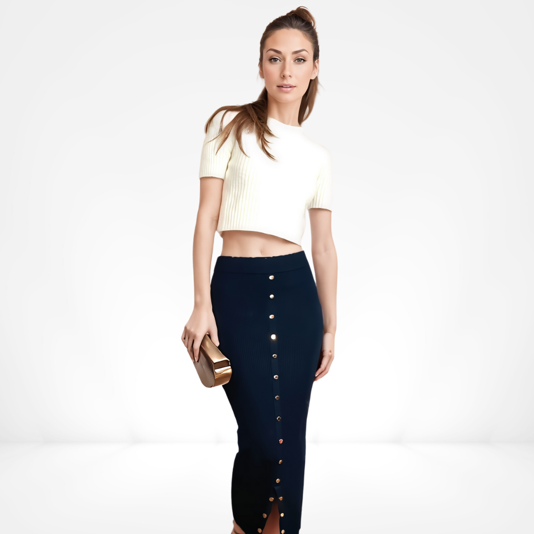 Crafted from a supple, ribbed stretch knit, this high-waisted pencil skirt sculpts the waist and glides over the hips with gentle ease. A row of polished metallic buttons traces the center front, offering just enough gleam to catch the eye without overpowering the refined finish. The ankle-grazing length and subtle vent lend a hint of movement, while the smooth elasticized waistband ensures all-day comfort. Pair it with a silk blouse and pointed-toe heels for an elegant office ensemble, or layer under a tailored blazer for a polished transition from daytime meetings to evening events.