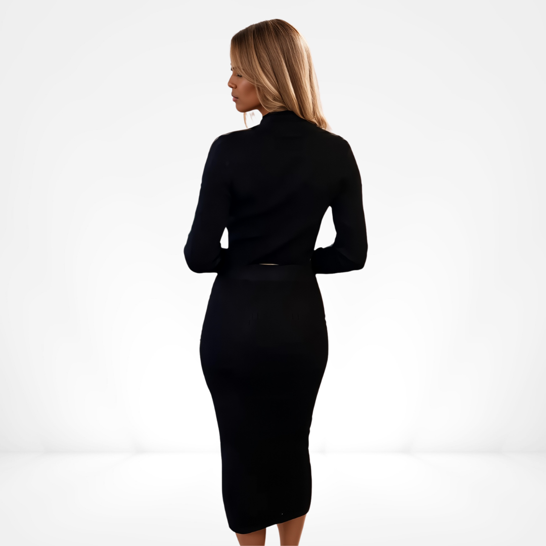 Crafted from a luxurious stretch-knit blend, the slim-fitting crop top features a graceful boat neckline and long, gently contoured sleeves. The matching high-waisted midi skirt sculpts the silhouette, punctuated by polished gold-tone buttons at the waist and a delicate front slit that whispers movement with every step. Style it with strappy metallic sandals, a sleek clutch, and minimal jewelry to highlight its chic simplicity—or layer under a tailored blazer for gallery openings and business-casual soirées.