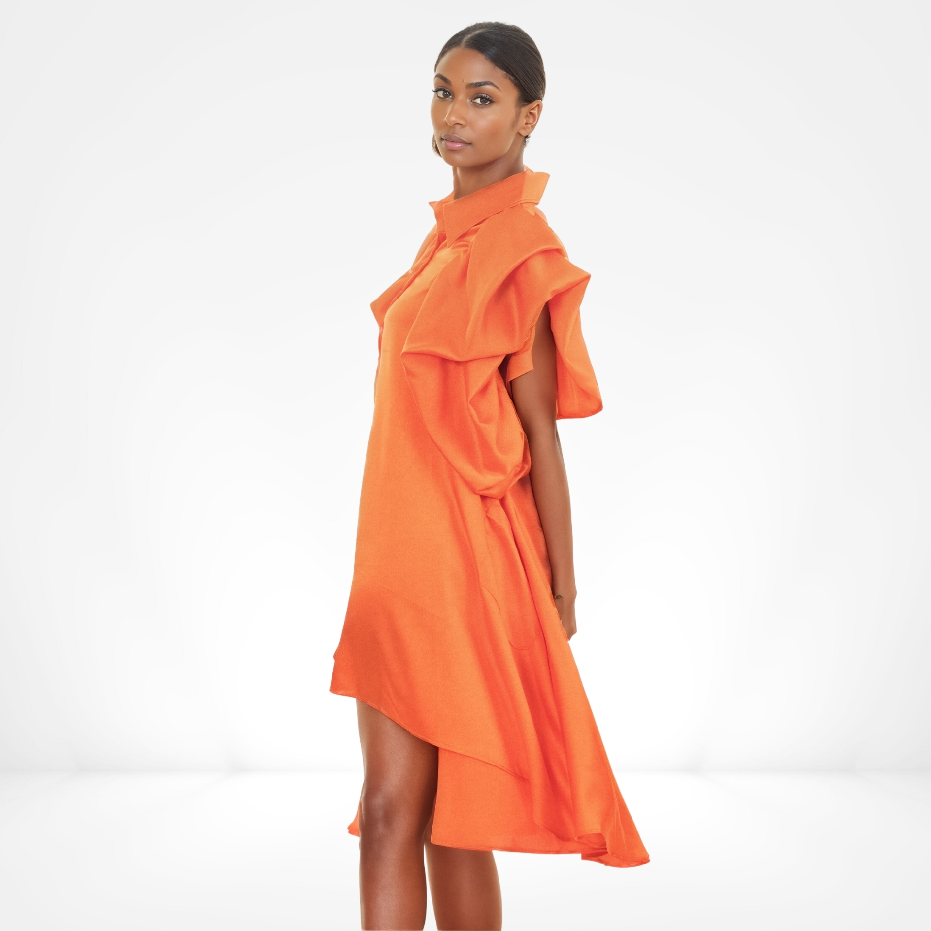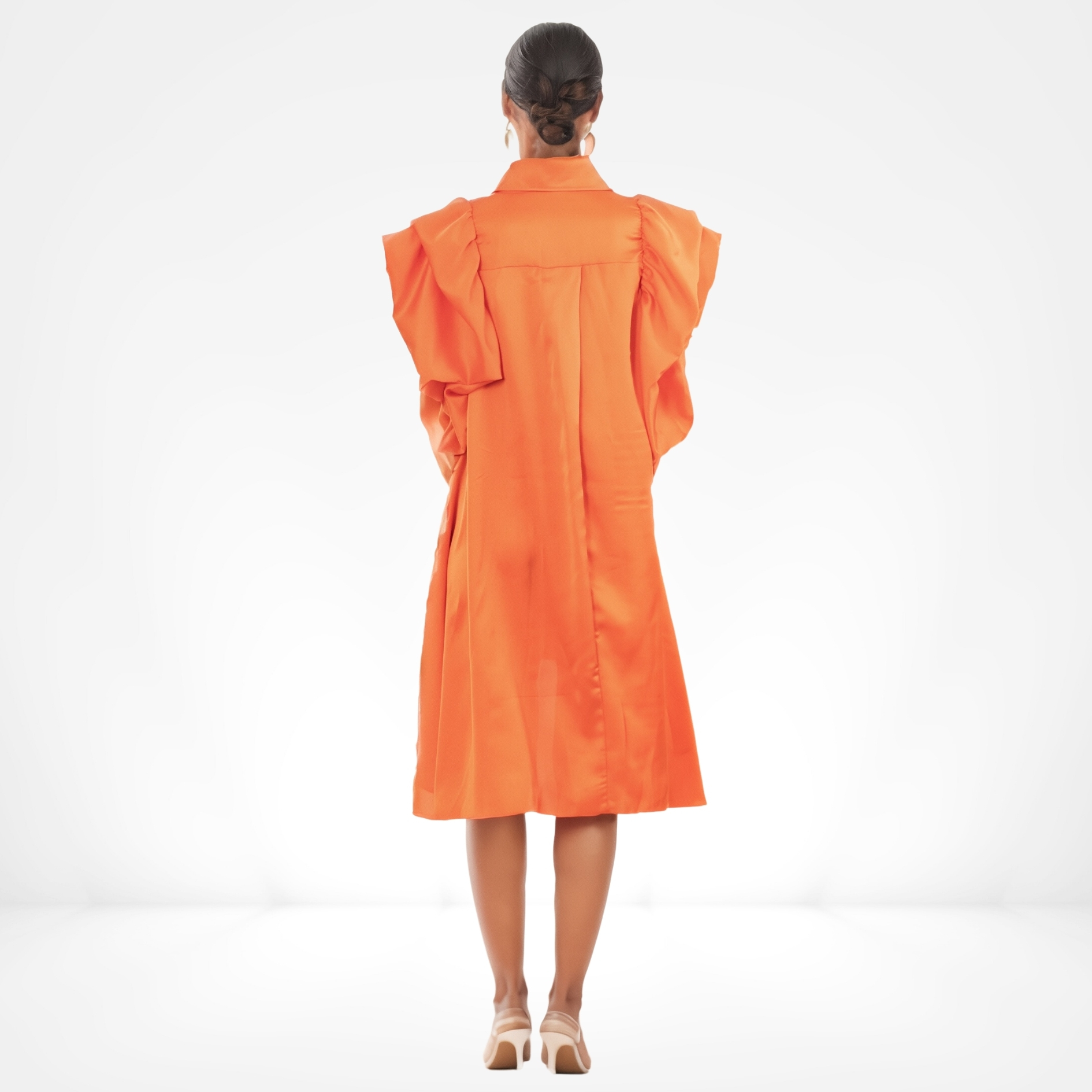 Make a vibrant statement with our Sunset Ruffle Midi Shirt Dress. This striking dress features a bold, sunset-inspired orange hue and dramatic ruffle detailing that adds a touch of modern elegance. The classic shirt dress silhouette is elevated with voluminous ruffles along the sleeves and a flowing, asymmetrical midi hemline.