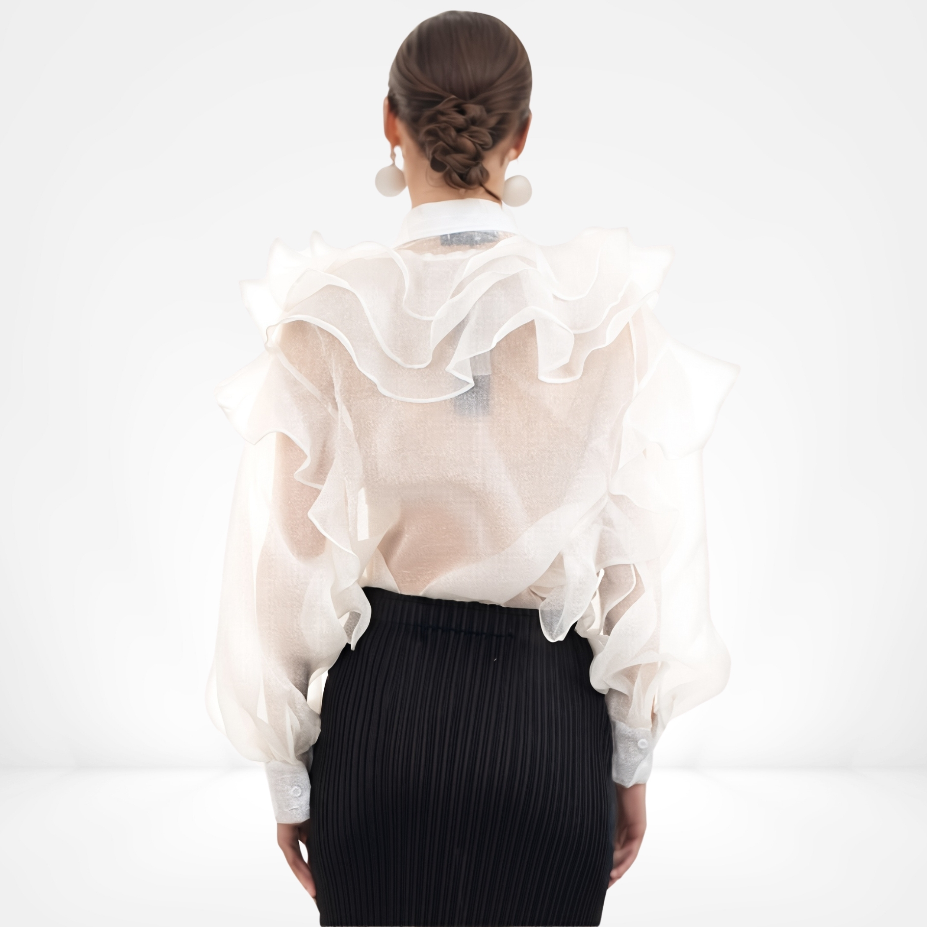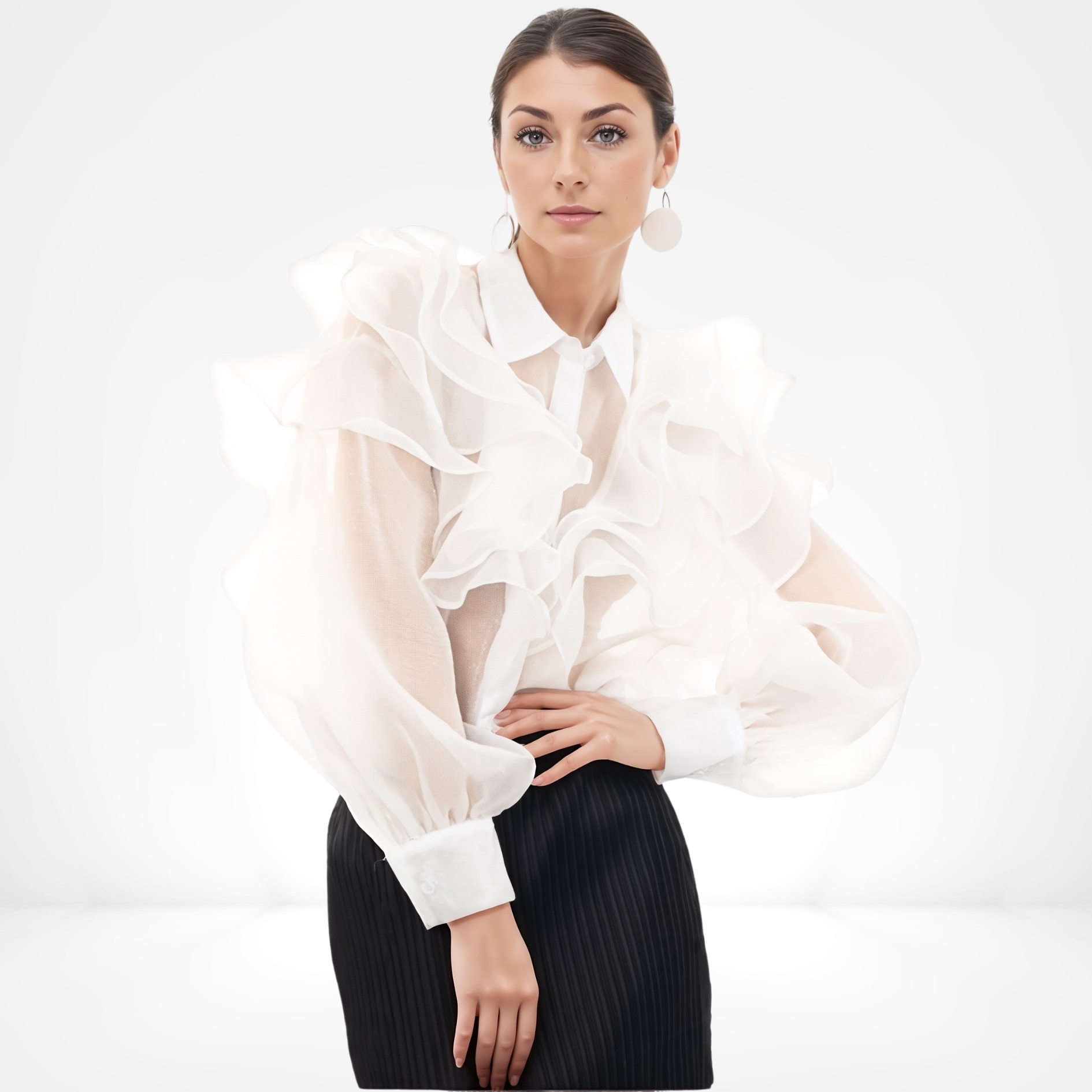 The classic button-down shirt silhouette is elevated with cascading ruffles that frame the shoulders and front, creating a dramatic and feminine effect. The long sleeves and collared neckline add a touch of sophistication, while the lightweight fabric ensures comfort and breathability. Pair it with tailored trousers, a sleek skirt, or your favorite jeans for a look that’s both chic and unforgettable.